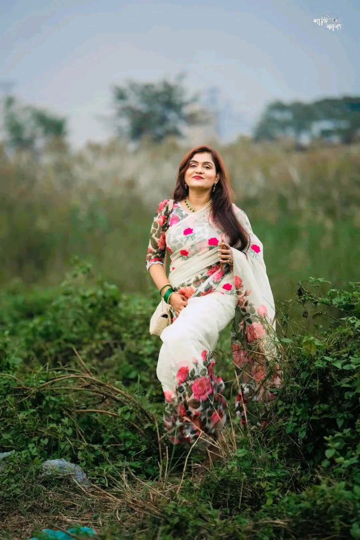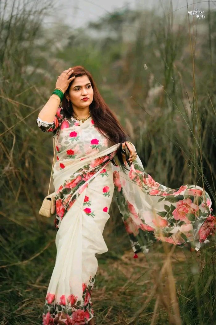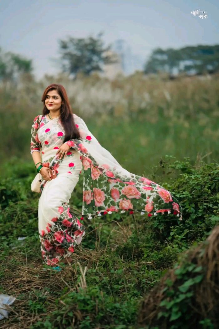 শাড়ির বিবরণ:ইন্ডিয়ান অরগাঞ্জা শাড়ি। একদম সফট। ফুল বডি ডিজিটাল প্রিন্ট কাজ করা। আঁচলে উন্নতমানের পুথি টার্সেল করা ও পুরো শাড়িতে লেস ও এমব্রয়ডারি সুতা দিয়ে কাজ করা।