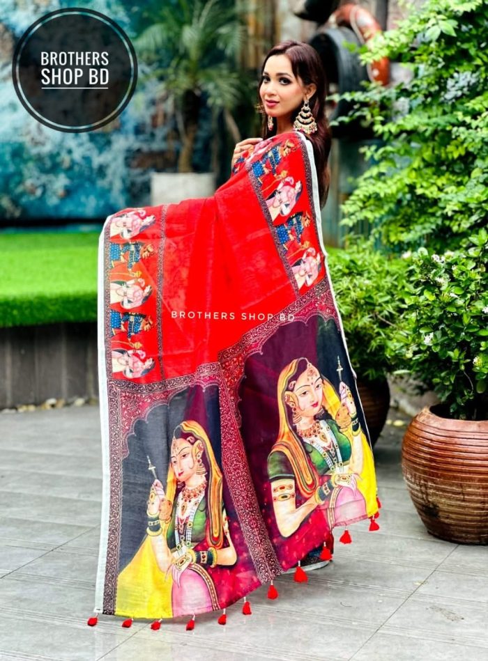 শাড়ির বিবরণ:টাঙ্গাইলা সিল্ক শাড়ি। একদম সফট। ফুল বডি ডিজিটাল প্রিন্ট কাজ করা। আঁচলে উন্নতমানের পুথি টার্সেল করা